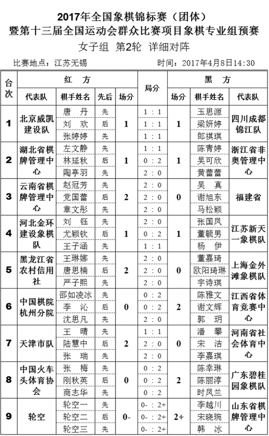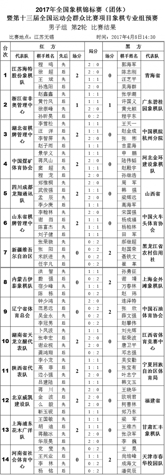 中国智力运动网讯 北京时间4月8日,“玉祁酒业杯”2017全国象棋锦标赛(团体)暨中华人民共和国第十三届运动会群众比赛项目象棋专业组预赛第2轮在江苏无锡进行。最 终卫冕冠军、东道主江苏队再度大胜,以7比1拿下了青海队,苏军夺得两战连捷。夺冠大热门四川队郑惟桐发力,6比2击败山西,杭州棋院负于湖北,煤矿力克 河北。两轮后江苏、四川、湖北、煤矿四支队伍连胜领军。