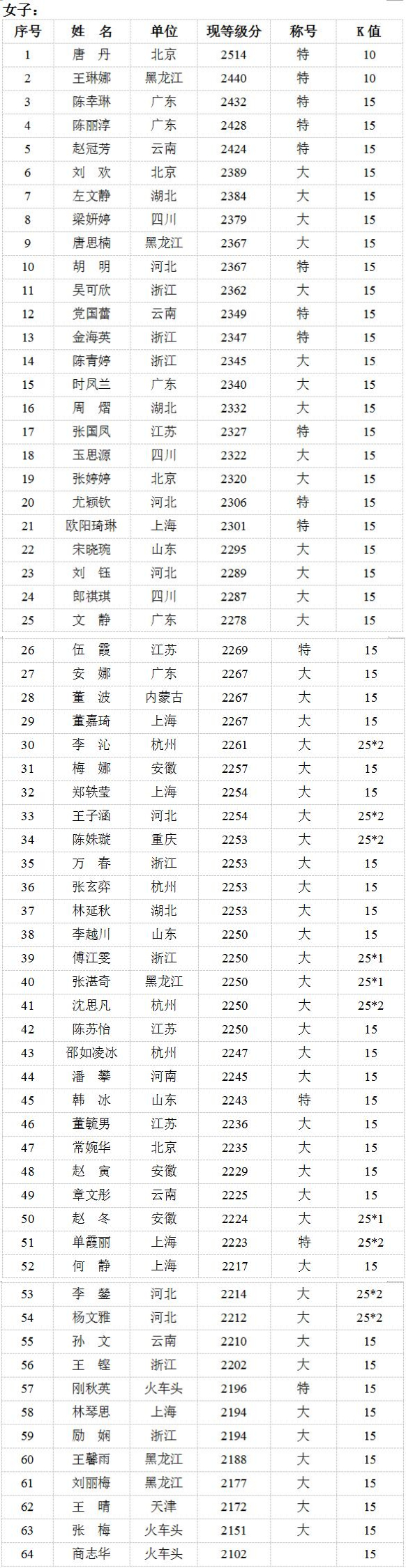 现将2017年下半年象棋棋手等级分予以公布,执行期为2017年7月1日至12月31日。