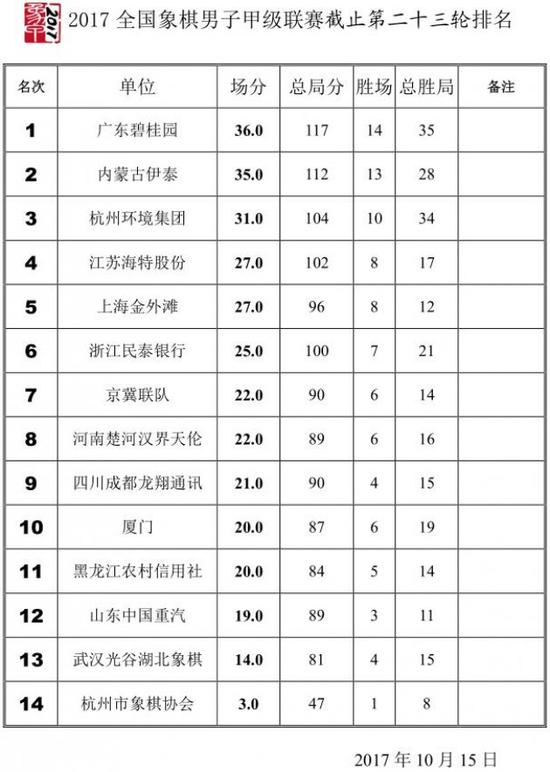 北京时间10月15日,腾讯棋牌天天象棋2017全国象棋男子甲级联赛第23轮的比赛在各主场战罢。最终一场积分榜上首尾大战,卫冕冠军广东队主场凭着许银川、郑惟桐的双枪发力,以6比2拿下杭州象协队,江苏做客同样比分击败湖北。京冀主场在连续痛失了三大好局后,反遭钟少鸿弃炮弃车惊天自杀成惊天妙杀一击拿下。浙江平杭州,山东和内蒙古,四川平黑龙江,河南和上海。