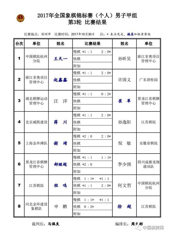 中国棋牌网讯 10月30日,2017年全国象棋个人赛16进8结束,王天一、赵鑫鑫、蒋川、谢靖、郝继超、徐超、程鸣、崔革晋级。