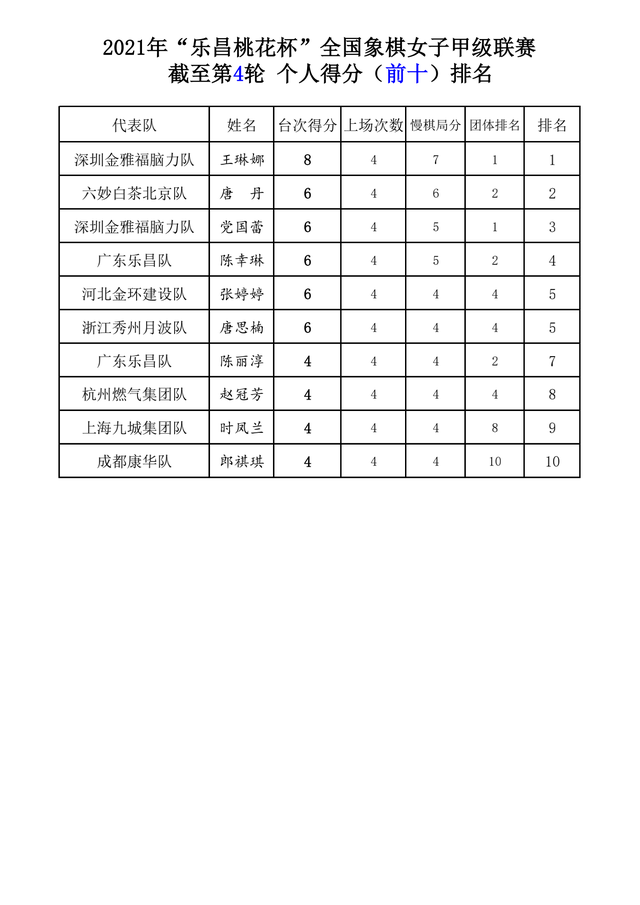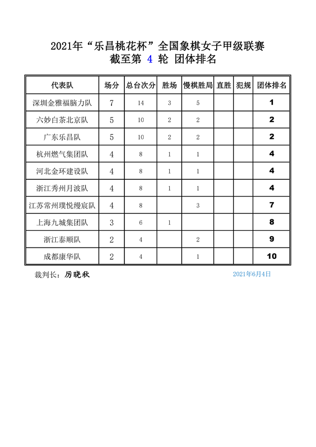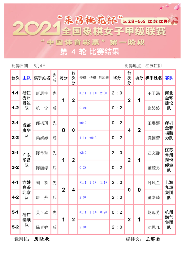 6月4日,2021年“乐昌桃花杯”全国象棋女子甲级联赛常规赛第4轮战罢。“大姐大”王琳娜棋艺精湛大获全胜,党国蕾读秒大战精彩险胜,“双星闪耀”的深圳队继续稳坐榜首,北京、广东两大豪门并列第二。